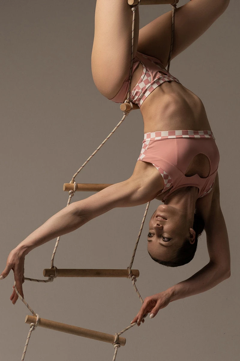 Make their hearts race in these high waisted, high leg shorts with a cut out waistband and sexy hip strap details. Created in this angelic baby pink checked fabric.Â