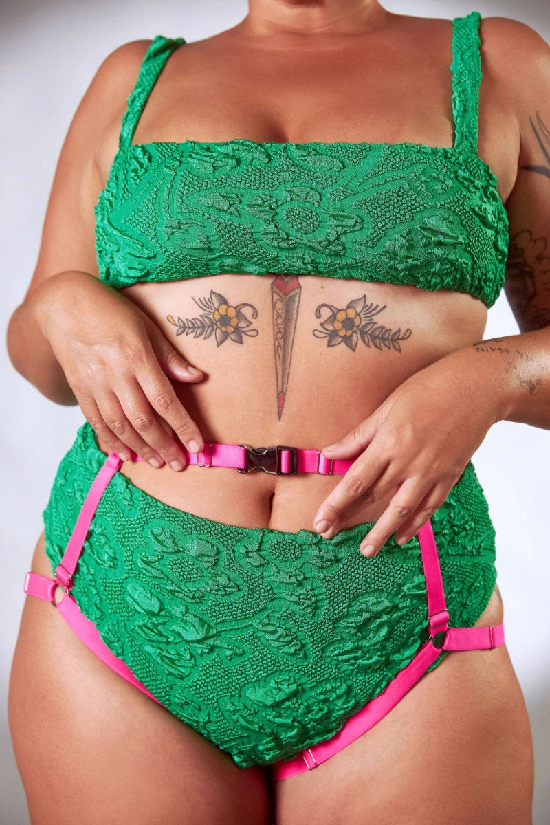 What’s not to love about this bottom harness? Neon pink elastic and silver hardware, the harness is adjustable to fit all bodies.